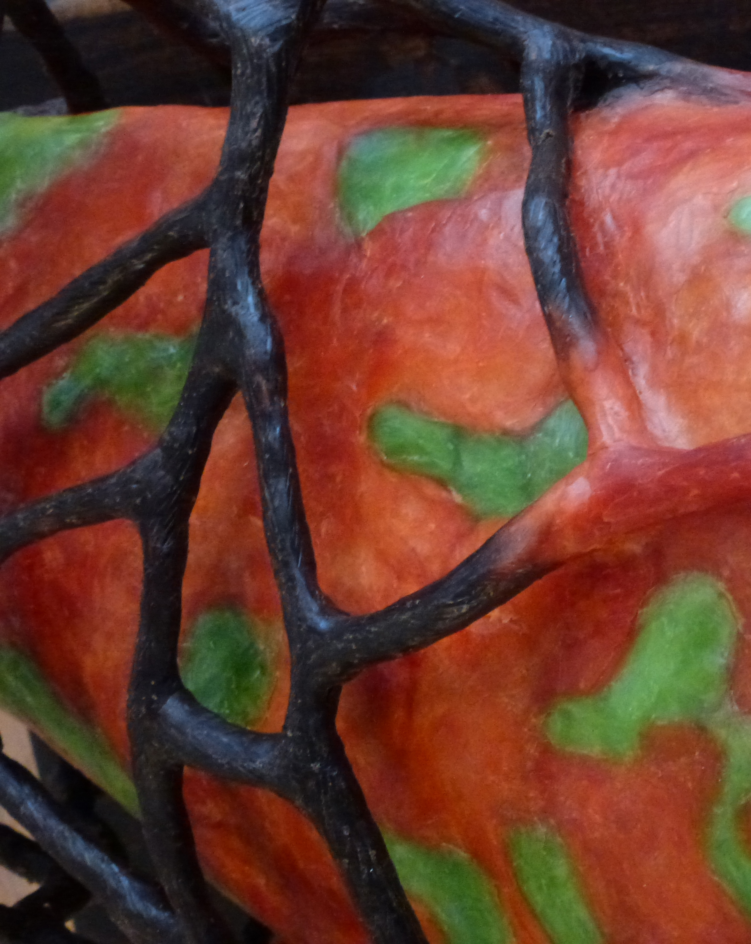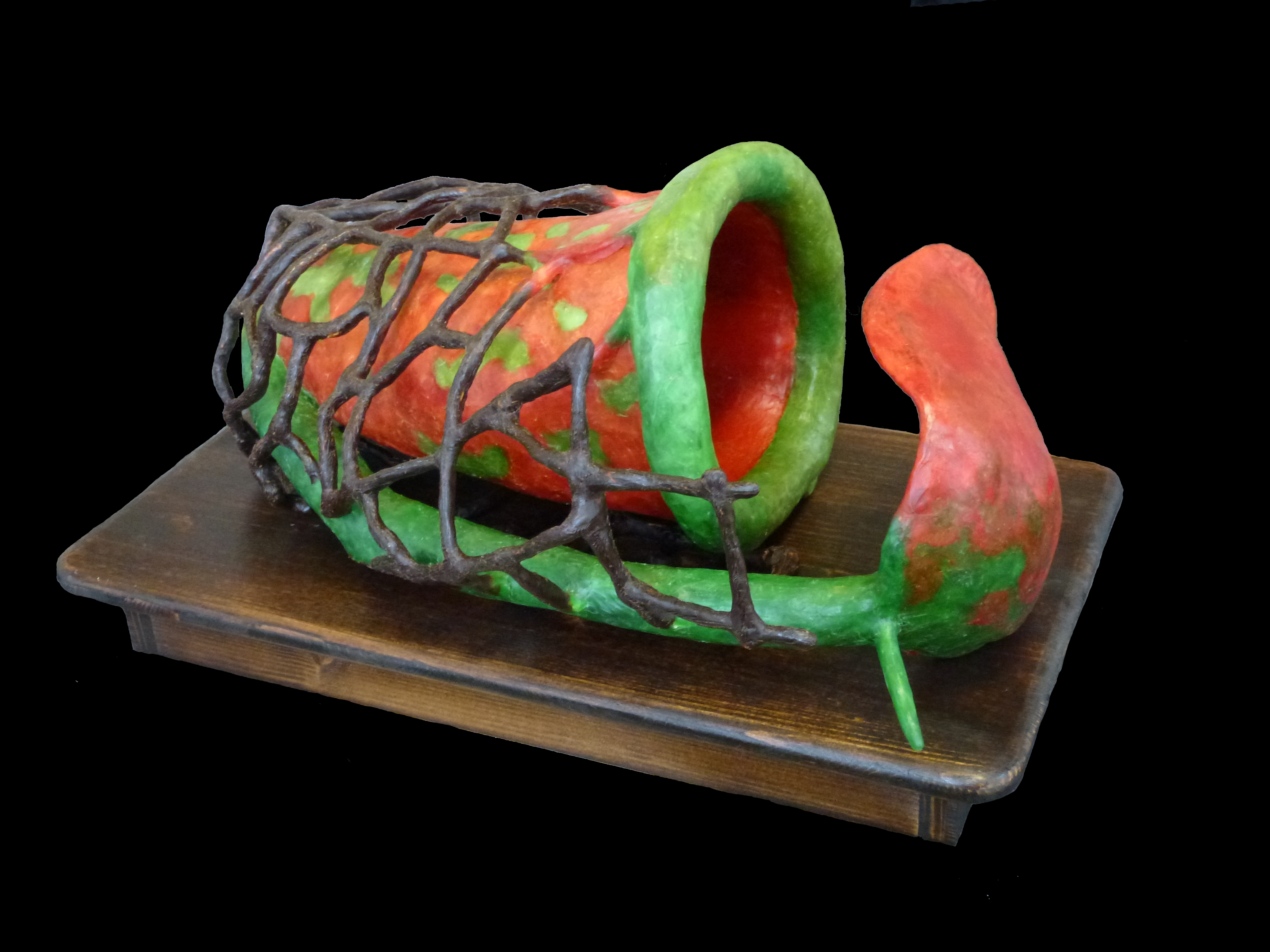 The third work is a big change within my artistic research. I was looking for a more suitable material which could better express the organic element of my work, because the clay made it look to dead an stiff, so in the end I chose wax. In order not to fall in the extreme abstraction of the second work, this time I looked images of real plants. I focused on the colors, especially their complementary contrasts and how they appear on the surface of plants and flowers. Now what was formerly just a cage structure it become an integral part of the work. The inside part does not have to break the cage, because in the develop of the organic element the cage merges naturally with the inner part.
