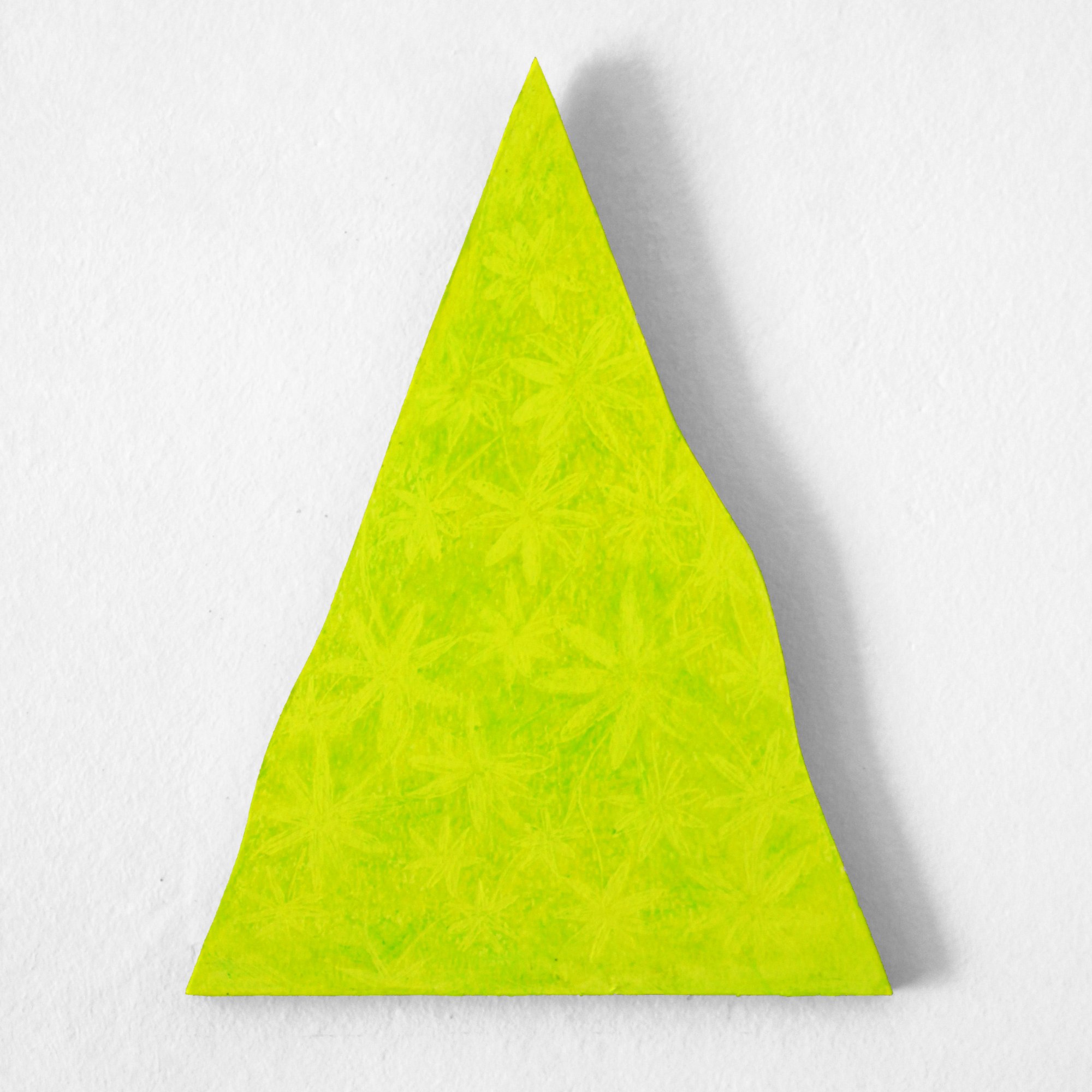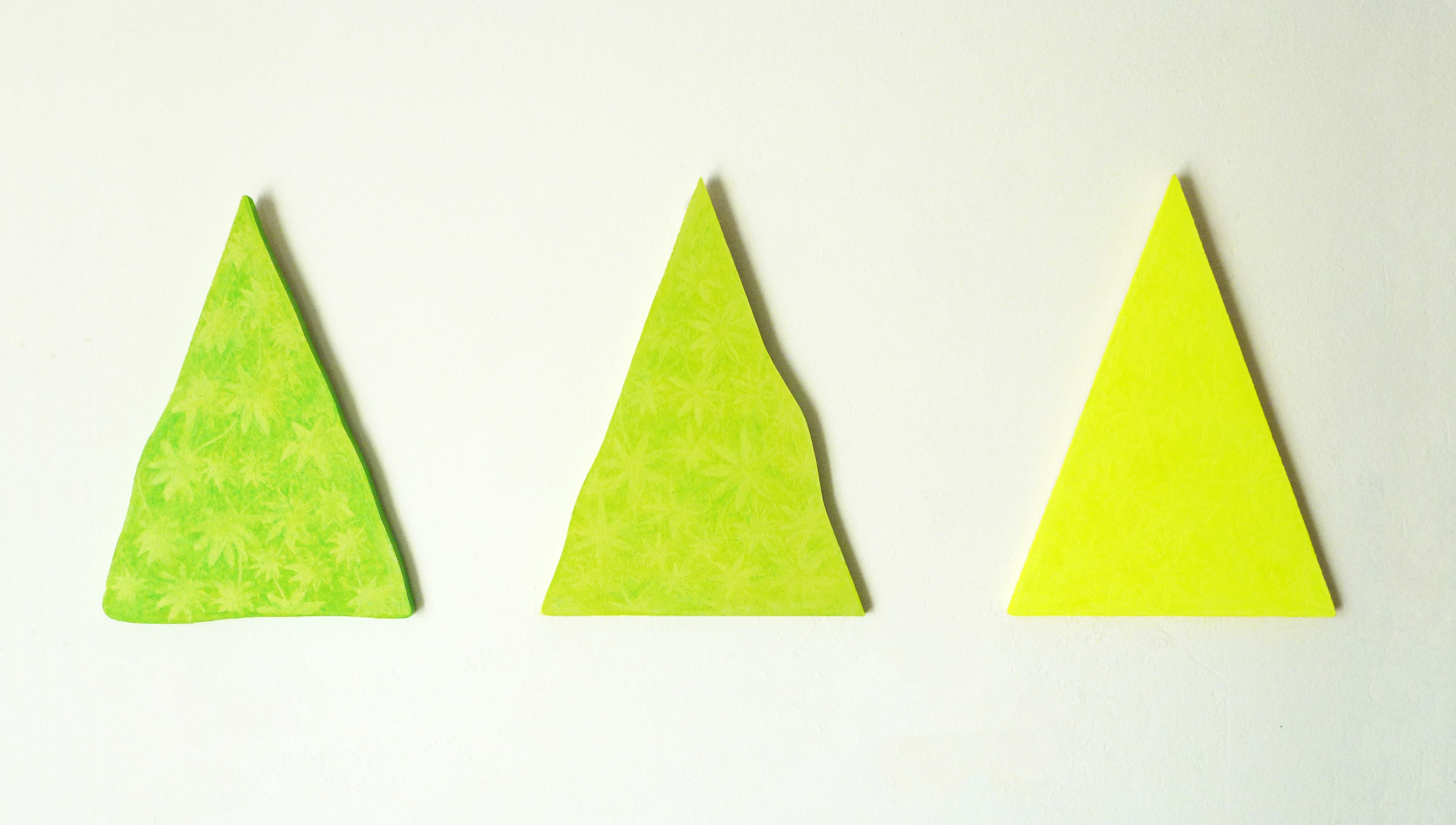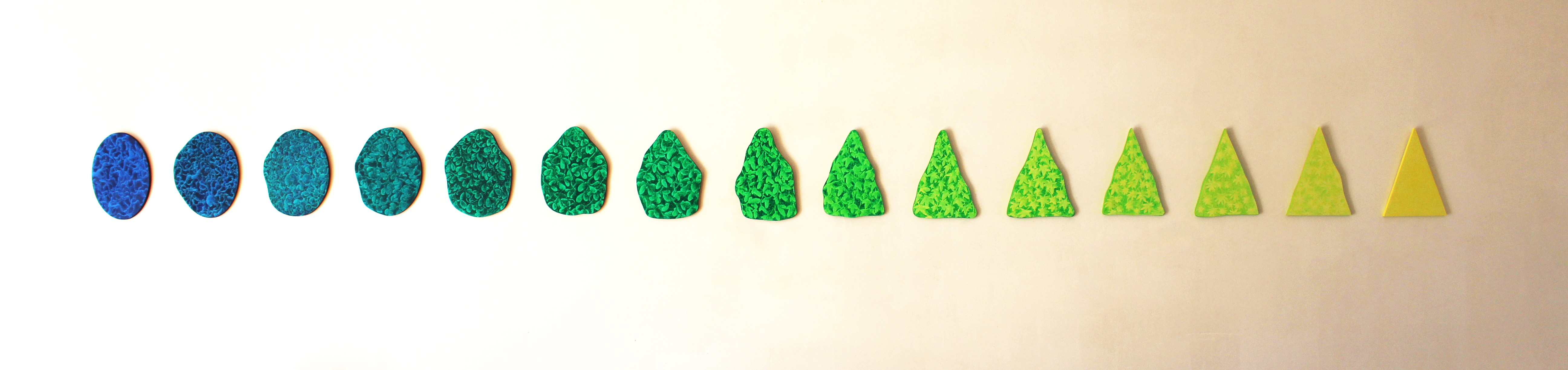 As soon as the light reaches the water inside the earth, the metamorphosis of the plant begins. When the power of the light starts to increase towards the blue, the perfection of the ellipse is breaking and the geometric shape is beginning to change. In the blue ellipse the environment allows only roots to grow. But already in the second form, where light is starting its action, it can be observed that something starts to sprout. This process, which continues through all the shades of green, changes the form of each piece itself. Starting from the shape of the ellipse and passing through expansion and contraction steps where in different way the leaves appear, the form reaches the shape of the pure yellow triangle. Here the element of water is completely absent, everything is light, therefore no more leaves but only flowers can be found.