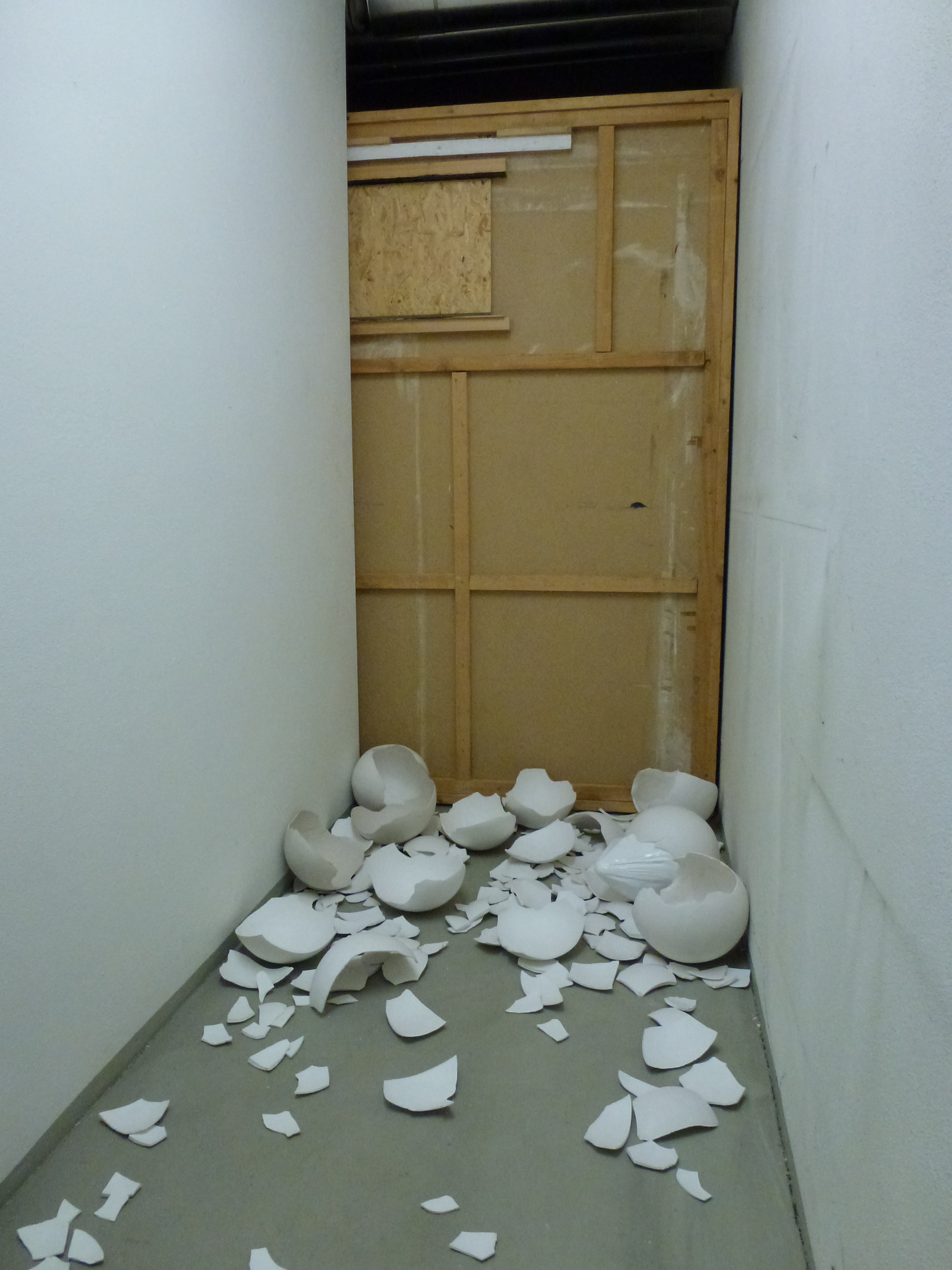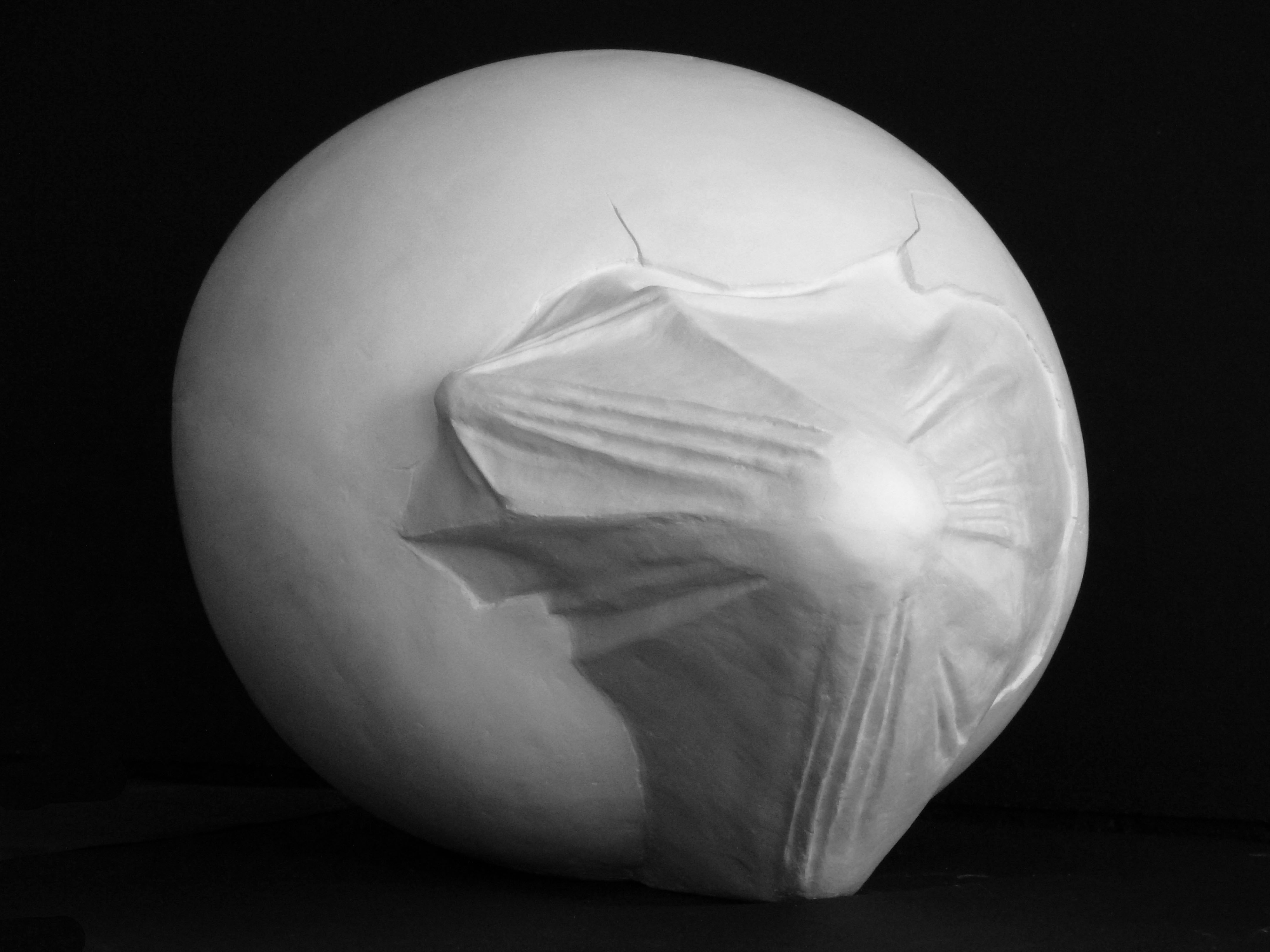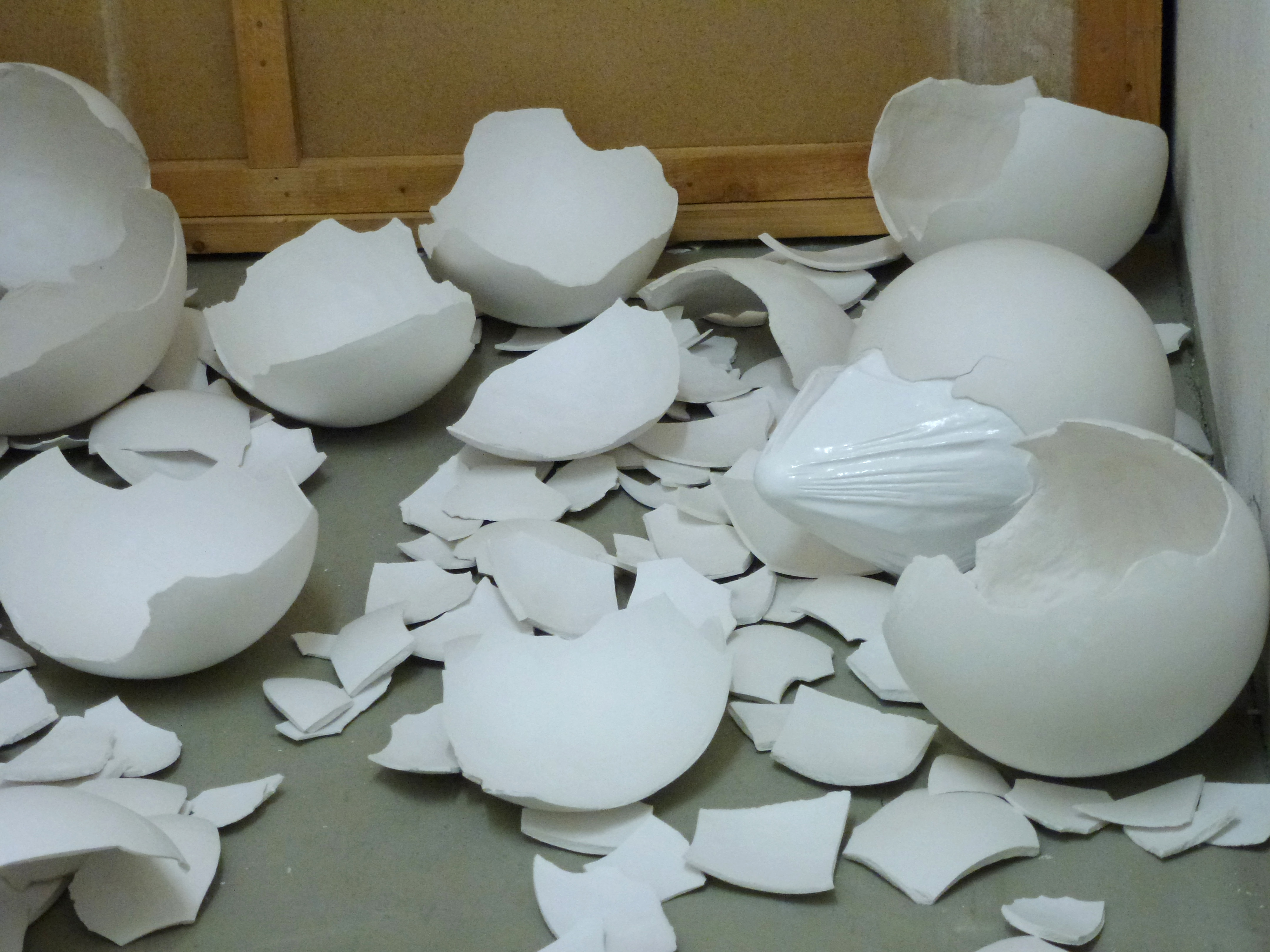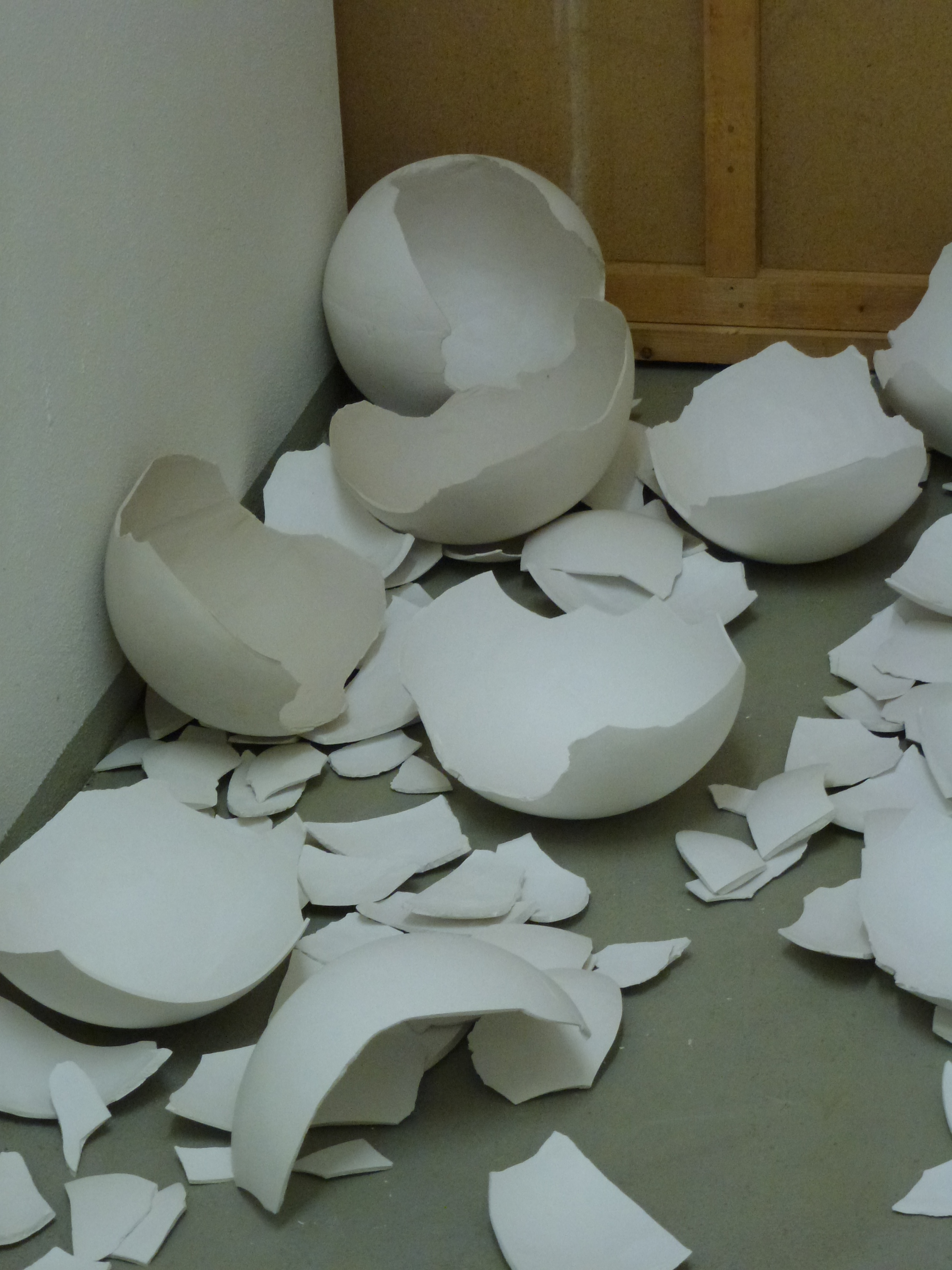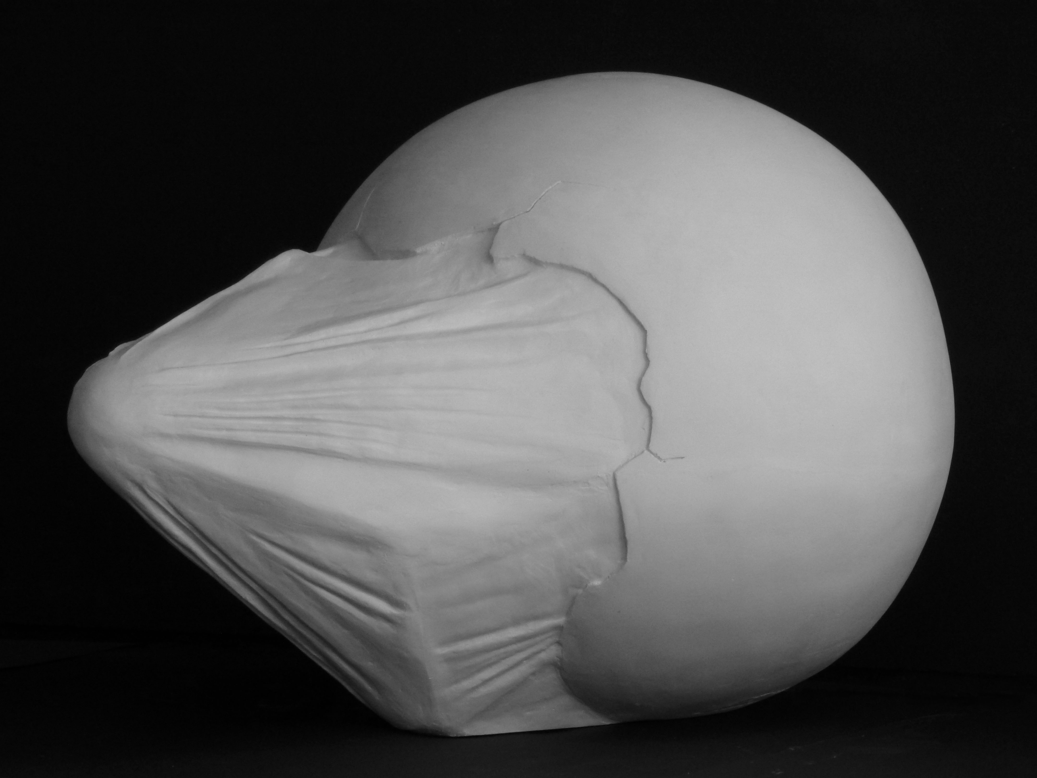 I looked, first, at the subject of animals which hatch from eggs. After I studied the structure of the egg, inside which, is always a soft skin, and I started to be interested in the contrast between the soft inside skin and the hard external part of the egg. This contrast is resolved between the geometrical shape of the egg and the folds that occur when the skin is pulled. I studied how turtles hatch from eggs and in the development of the work I found a form of something born which has been so abstracted it no longer resembles a specific animal. The work reveals the struggle of birth, it sits within an installation of broken eggs to recreate a kind of nest.